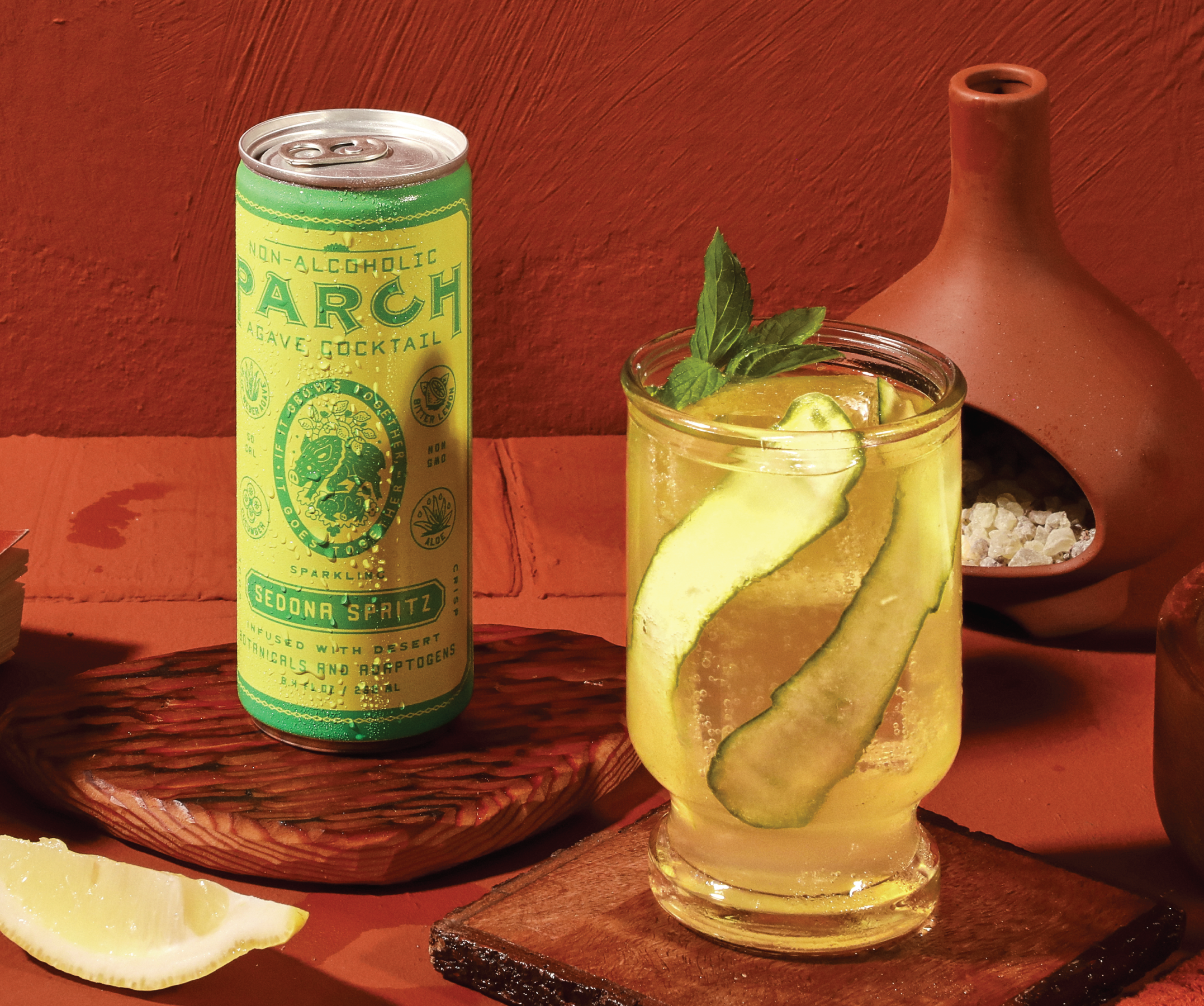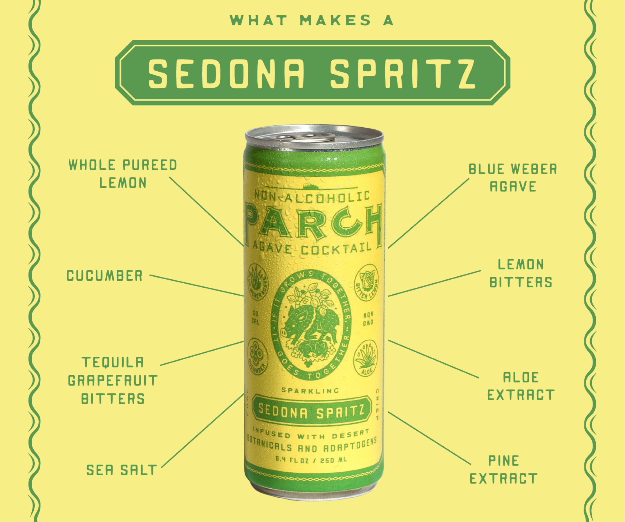 Reminiscent of Red Rock hikes and cool sunset sips, our SEDONA SPRITZ blends crisp cucumber juice with whole puréed lemons, hydrating aloe, organic Mexican agave, and magnesium-rich Sonoran Desert salt to quench your thirst and restore your balance. We then finish with a touch of pine as tribute to the Ponderosa Pines that line the mystical and majestic Arizona landscape we call home.